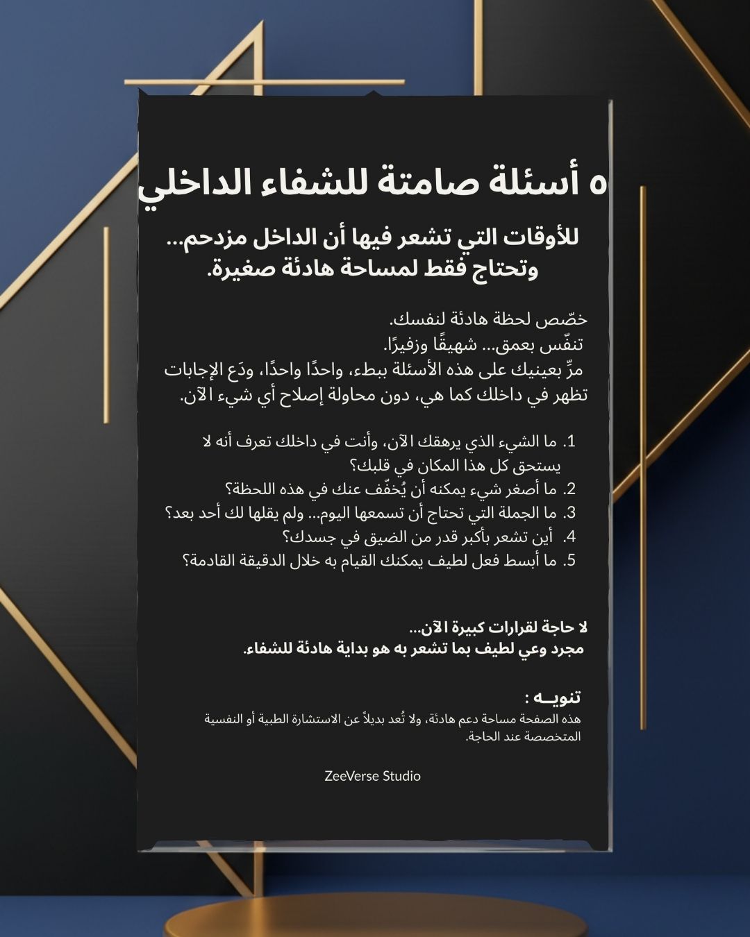 يقدّم لك هذا الملف الرقمي المصمّم بأسلوب ZeeVerse minimal premium خمس أسئلة صامتة تساعدك على التهدئة، ترتيب الداخل، واستعادة التوازن بلطف.